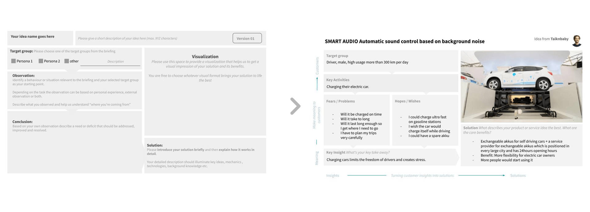 Using modern design thinking methods, we started creating a unique version of an idea template. Describing the idea on one screen or one A4-sized slide should be the new basis for every idea submission.